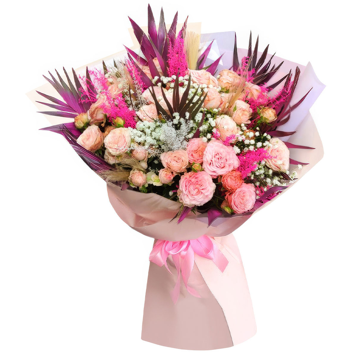 Роза кустовая розовая, гипсофила, листья пальмы, целозия. Упаковка (лента, пленка, крафт, сетка, пленка матовая)