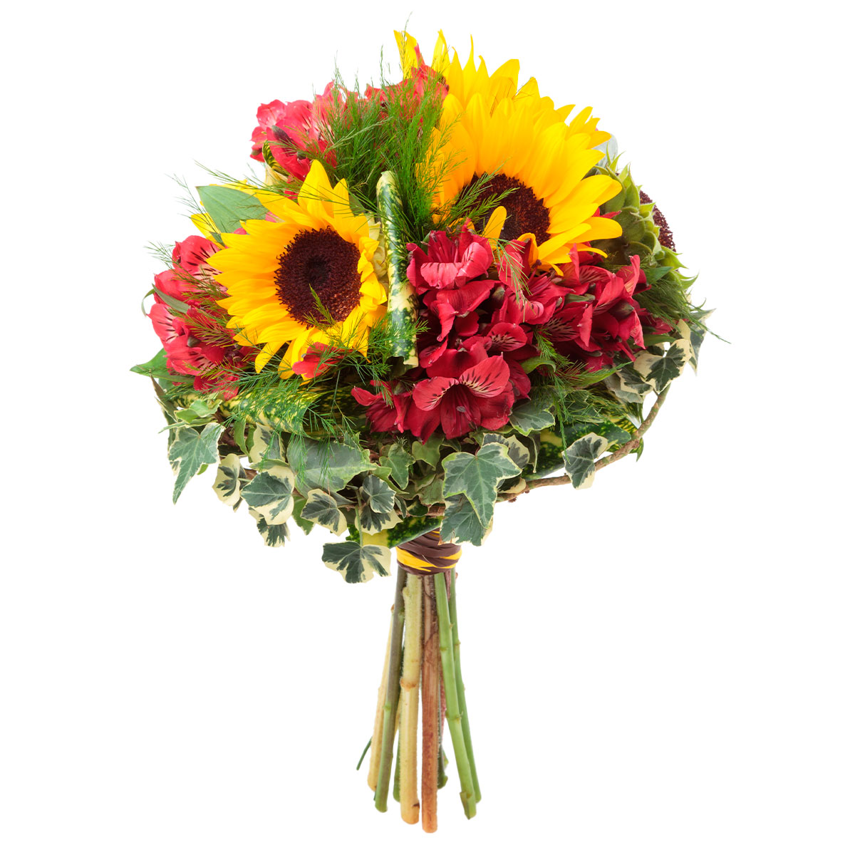 Подсолнух, альстромерия красная, плющ, аспарагус. Упаковка (лента, пленка, крафт, сетка, пленка матовая)