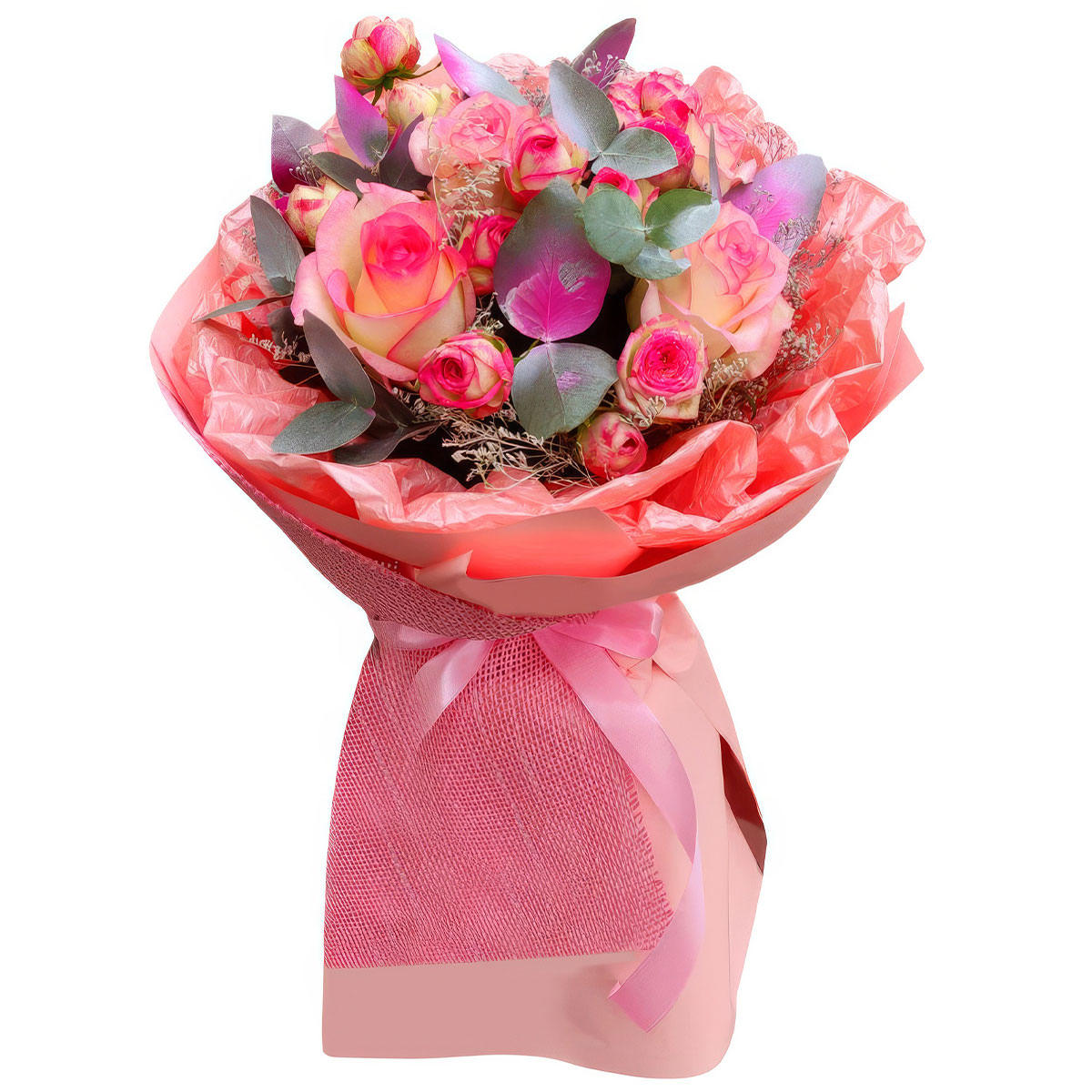 Роза одноголовая розовая, роза кустовая розовая, эвкалипт.Упаковка (лента, пленка, крафт, сетка, пленка матовая)