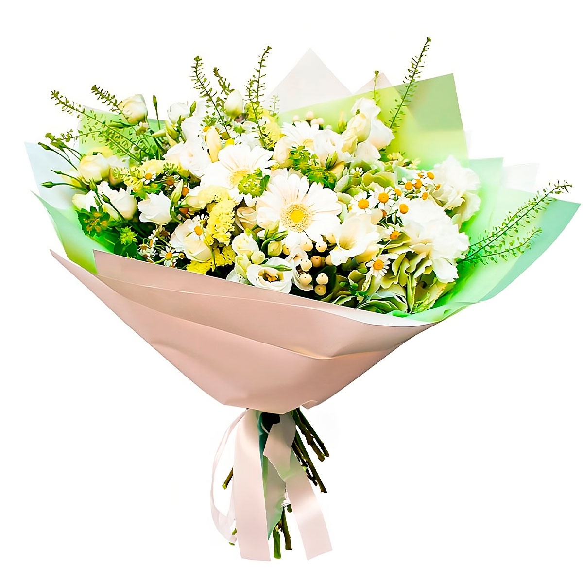 Гербера белая, ромашка, роза кустовая белая, гортензия зеленая, эустома белая, гиперикум, статица желтая, зелень. Упаковка (лента, пленка, крафт, сетка, пленка матовая)