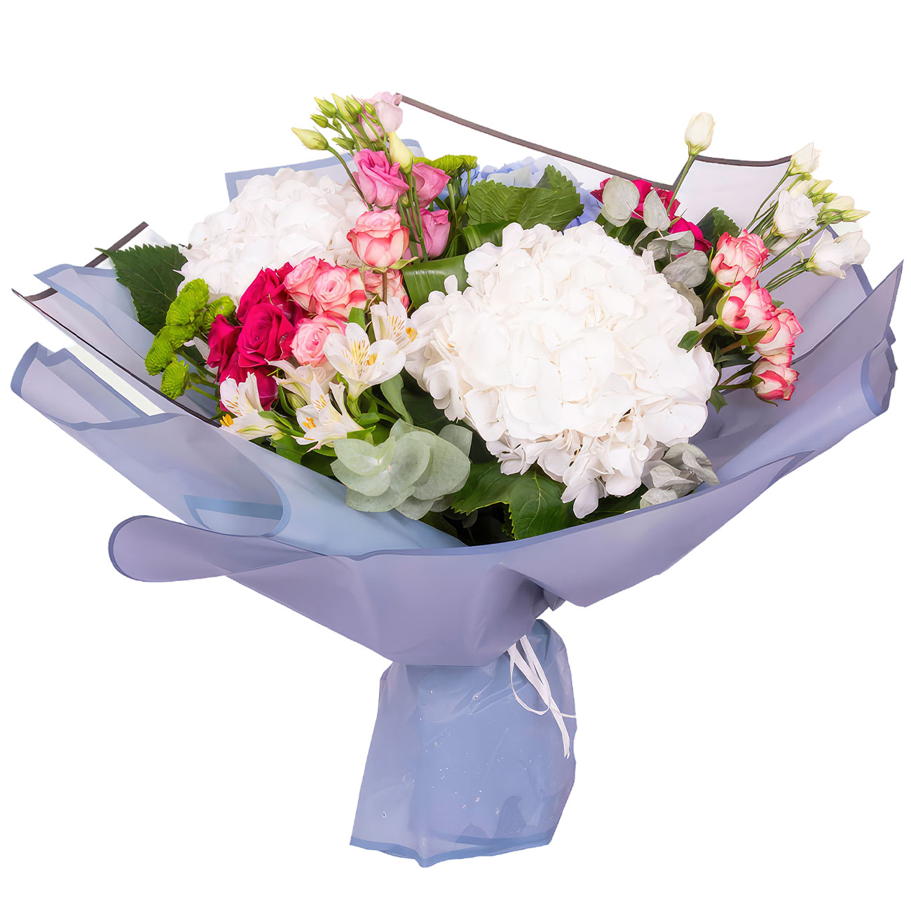 | Состав | Альстромерии, Гортензии, Кустовые розы, Розы, Эвкалипт, Эустомы |
