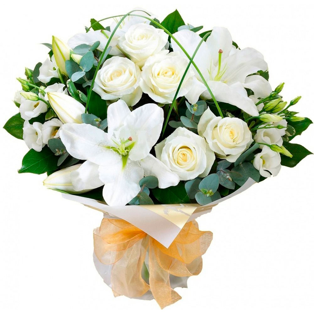 Роза одноголовая белая, лилия белая, эустома белая, берграсс. Упаковка (лента, пленка, крафт, сетка, пленка матовая)