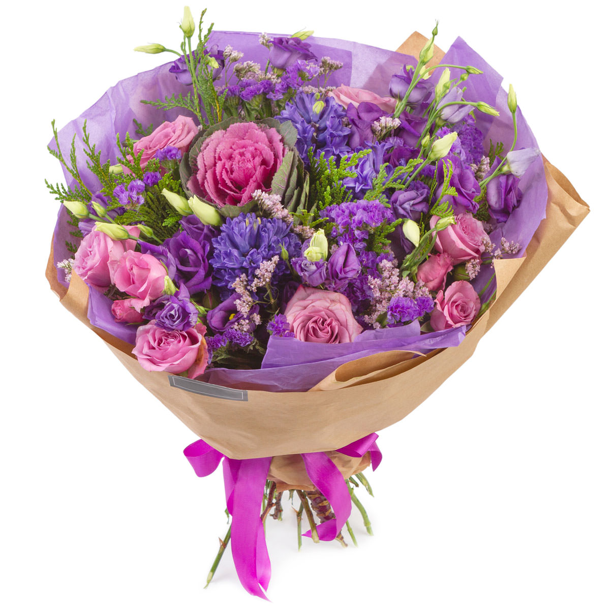 Гиацинт фиолетовый, брассика, роза кустовая розовая, эустома фиолетовая, статица фиолетовая и розовая, туя. Упаковка (лента, пленка, крафт, сетка, пленка матовая)