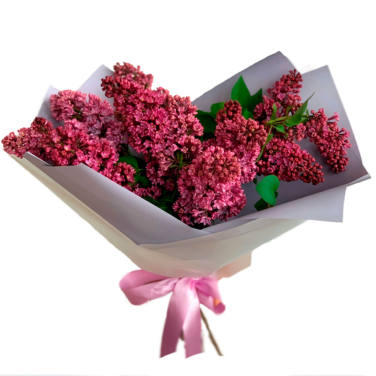 Сирень фиолетовая, зелень. Упаковка (лента, пленка, крафт, сетка, пленка матовая)