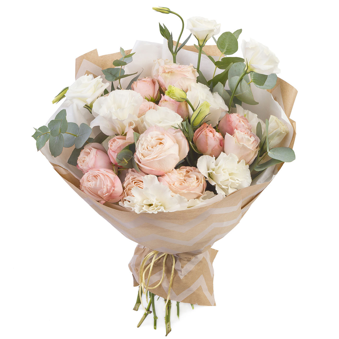 Роза пионовидная розовая, эустома белая, эвкалипт. Упаковка (лента, пленка, крафт, сетка, пленка матовая)