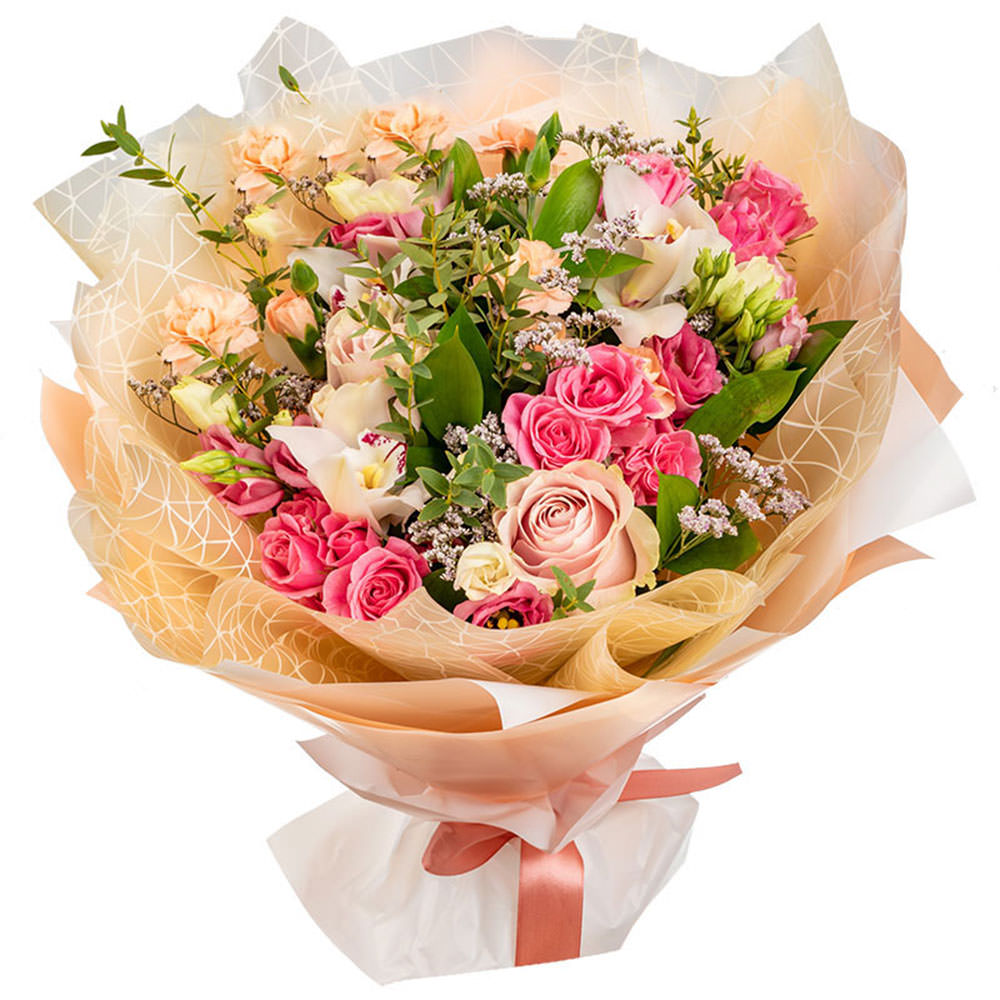 Роза кустовая розовая, роза одноголовая светло-розовая, орхидея белая, фисташка, гипсофила. Упаковка (лента, пленка, крафт, сетка, пленка матовая)