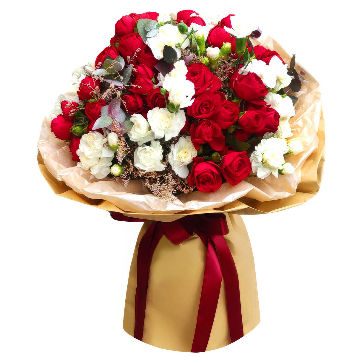 Роза кустовая красная и белая, эвкалипт. Упаковка (лента, пленка, крафт, сетка, пленка матовая)
