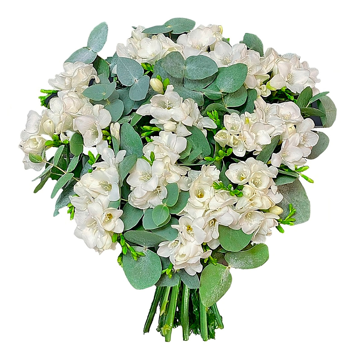 Фрезия белая, эвкалипт, зелень. Упаковка (лента, пленка, крафт, сетка, пленка матовая)