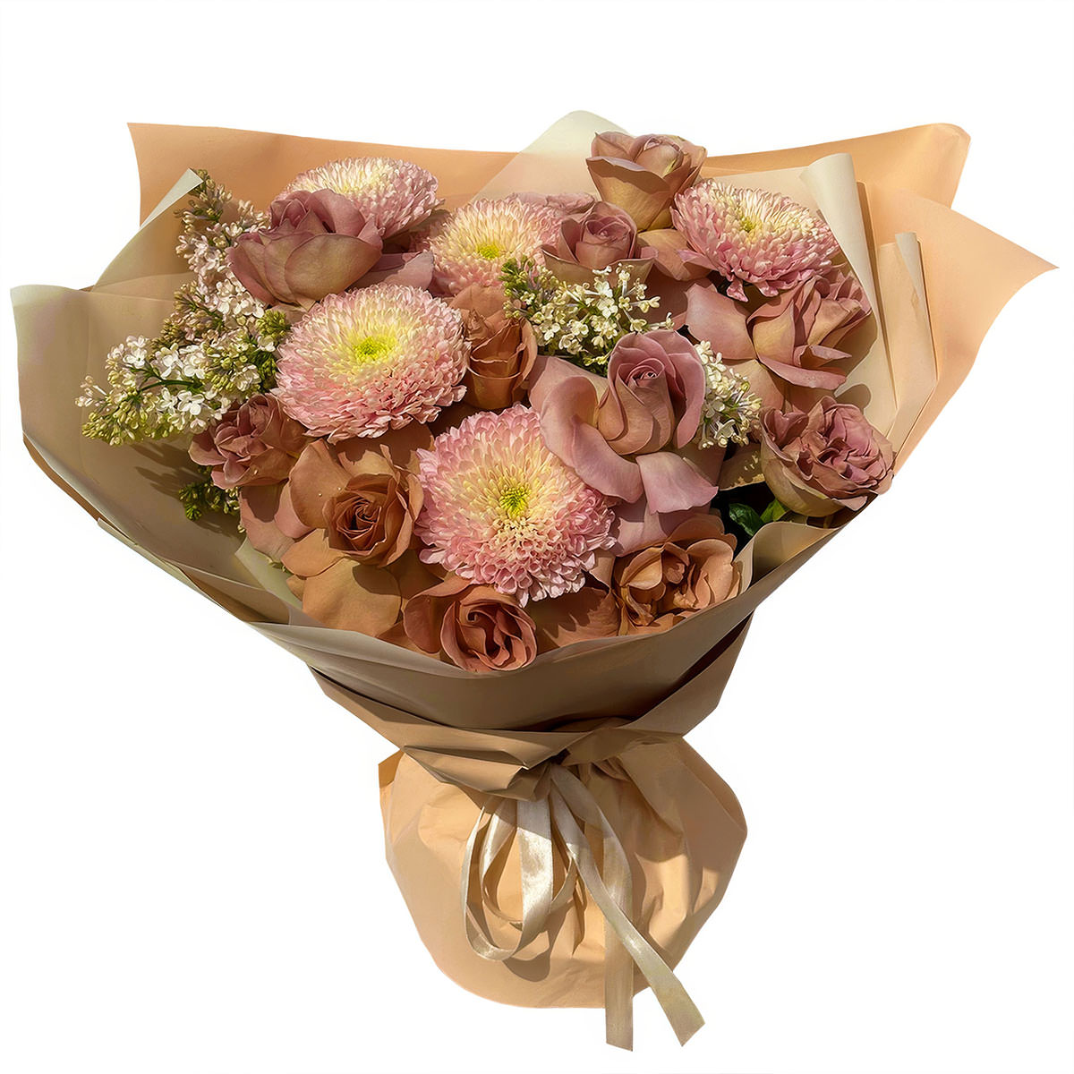 Астра персиковая, сирень белая, роза одноголовая чайная. Упаковка (лента, пленка, крафт, сетка, пленка матовая)