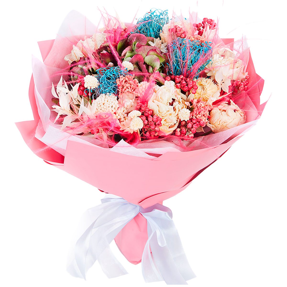 Гортензия розово-зеленая, гиперикум, сухоцветы, пион белый, перья. Упаковка (лента, пленка, крафт, сетка, пленка матовая)