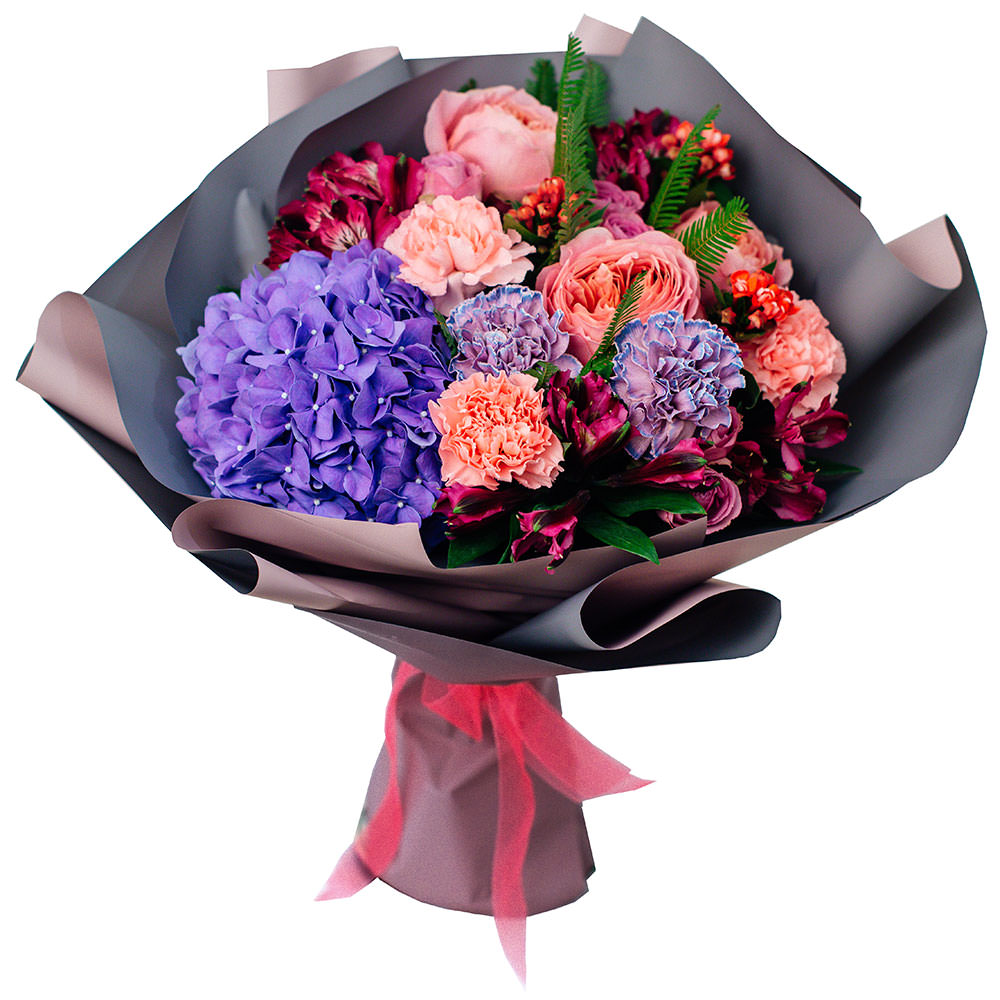Гвоздика персиковая и фиолетовая, гортензия фиолетовая, альстромерия бордовая, роза розовая, папоротник. Упаковка (лента, пленка, крафт, сетка, пленка матовая)