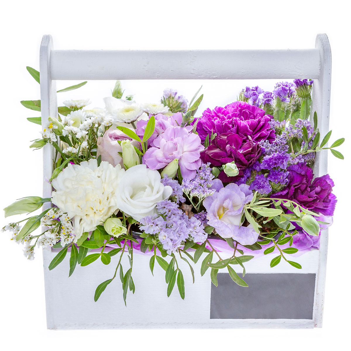 Гвоздика сиреневая и белая, эустома белая, хризантема кустовая белая, статица, фисташка. Упаковка (Корзина, оазис, ящик).