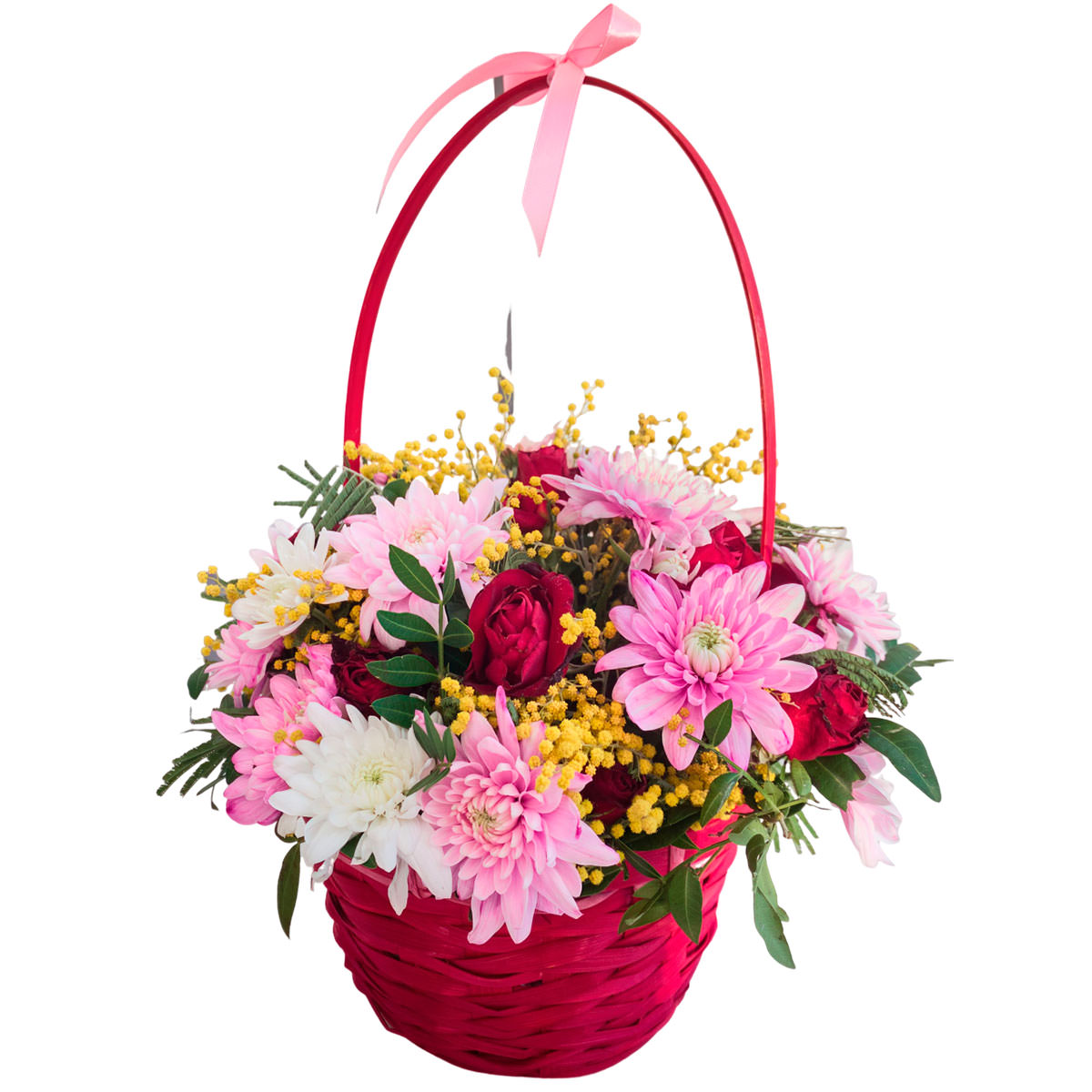 Хризантема розовая и белая, роза одноголовая красная, мимоза. Упаковка (Корзина, оазис, ящик).