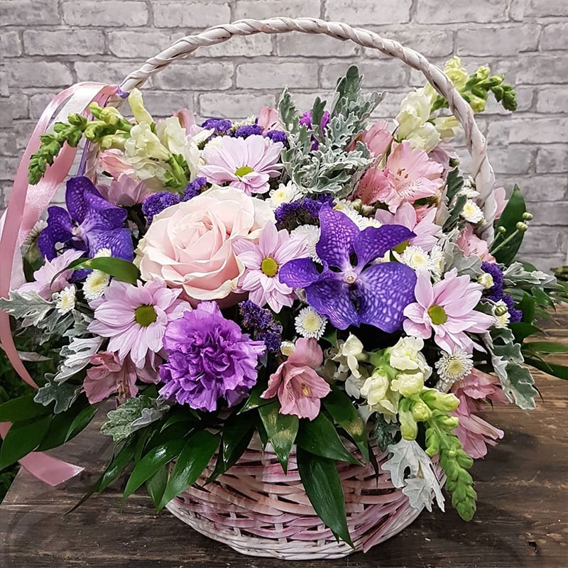 Роза одноголовая розовая, альстромерия красная, хризантема кустовая желтая, ирис, гвоздика фиолетовая, брасика. Упаковка (шляпная коробка, квадратный бокс, коробка сердце, оазис)