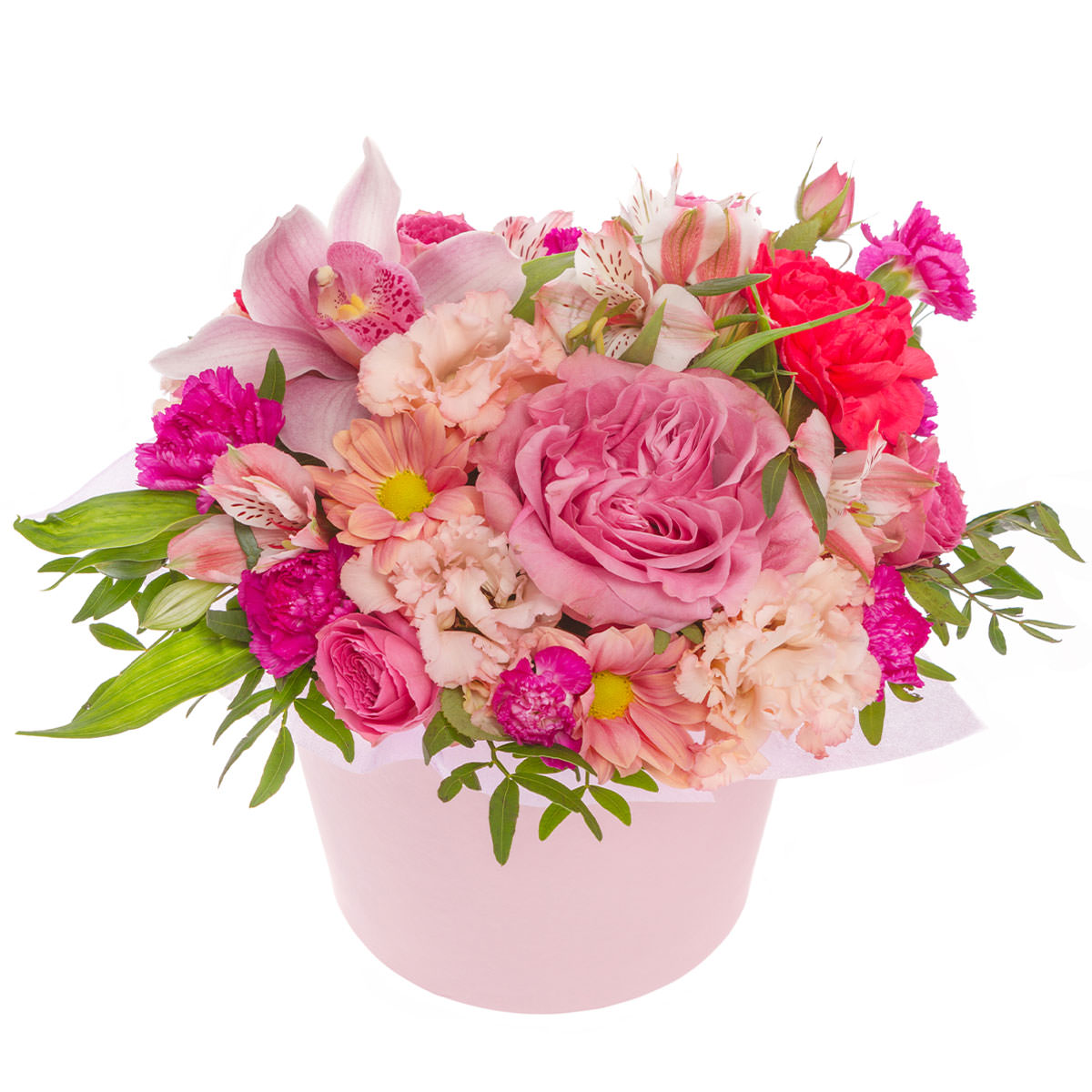 Роза одноголовая розовая и красная, орхидея розовая, гвоздика кустовая мини сиреневая, эустома нежно-розовая, альстромерия нежно-розовая, хризантема кустовая нежно-розовая, фисташка. Упаковка (шляпная коробка, квадратный бокс, коробка сердце, оазис)