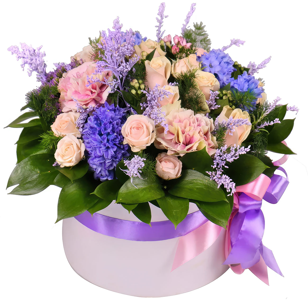 Гиацинт синий, роза кустовая кремовая, диантус розовый, роза одноголовая кремовая, зелень. Упаковка (шляпная коробка, квадратный бокс, коробка сердце, оазис)