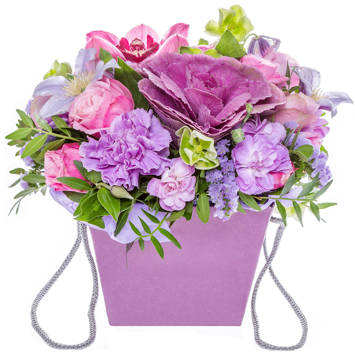 Декоративная капуста, орхидея розовая, роза одноголовая розовая, клематис, статица сиреневая, петуния сиреневая, фисташка. Упаковка (шляпная коробка, квадратный бокс, коробка сердце, оазис)