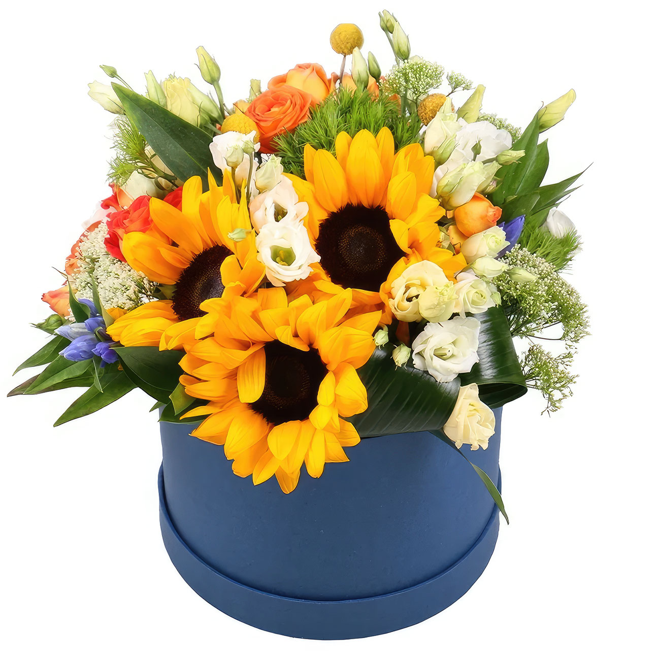 Цветы в коробке «Подсолнечное настроение» с доставкой по г Юрюзань: вы можете купить букет в интернет-магазине цветов «Флормания» по цене от 3390 руб.