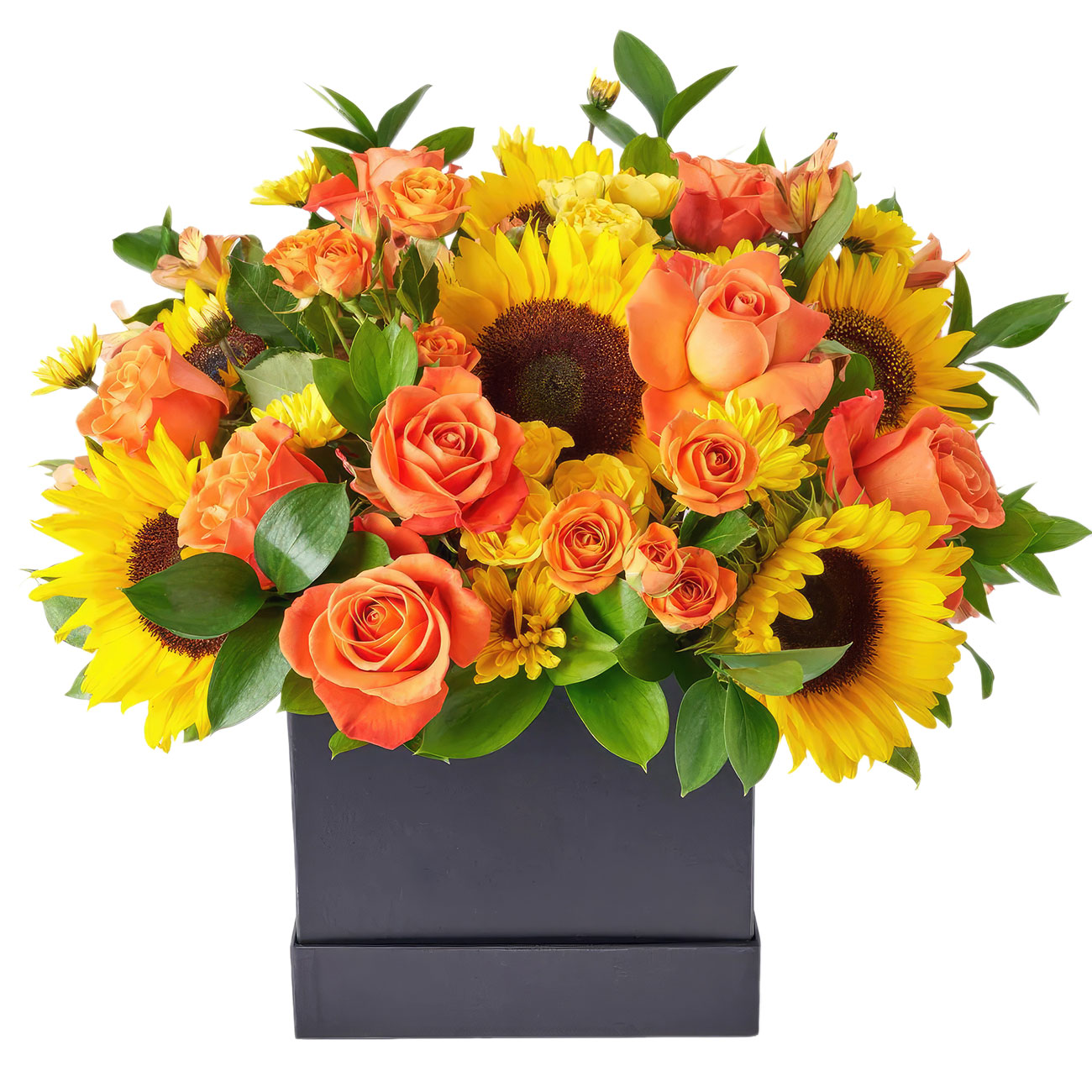 Подсолнух, роза кустовая оранжевая, желтая, хризантема кустовая желтая, альстромерия оранжевая. Упаковка (шляпная коробка, квадратный бокс, коробка сердце, оазис)