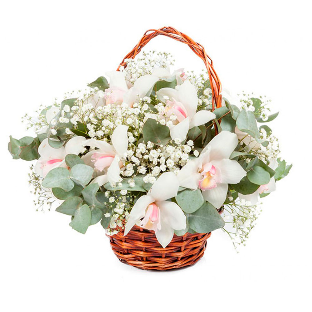 Орхидея белая, эвкалипт, гипсофила. Упаковка (Корзина, оазис).